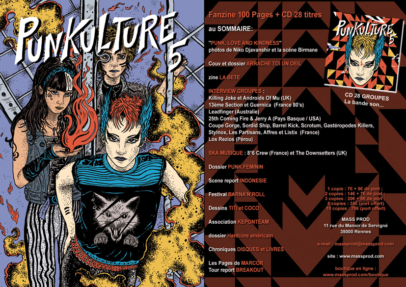 Oui il ressemble à la Mass Prod en effet, son contenu est très varié dans les styles musicaux comme dans la géographie des groupes et scènes présenté(e)s… La différence est que Mass prod produit des groupes actuels uniquement alors que Punkulture est heureux de parler du passé. Dans le prochain numéro nous consacrons pas mal de pages au femmes dans le punk, nous voyagerons en Indonésie, Birmanie et aurons aussi des groupes français des années 80s (Guernica, 13ème Section) comme des groupes actuels (Listix, Stylnox, Gastéropodes Killers)…